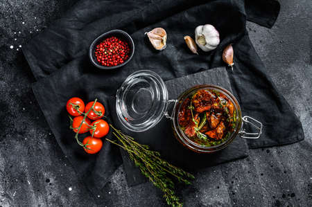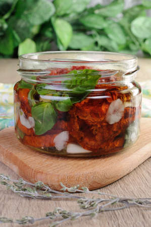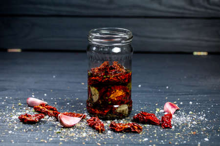 Sun-dried pickled tomatoes in oil and herbs. Classic italian appetizer for wine in italian cuisine. Vegetarian snack.