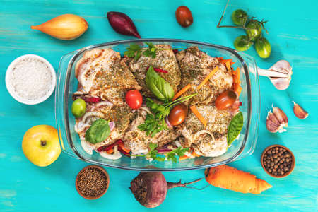Raw fresh chicken thighs with spices and vegetables in a glass bowl. Many food ingredients on light blue wooden background. Top view, shallow depth of the field, toned and processing photo.
