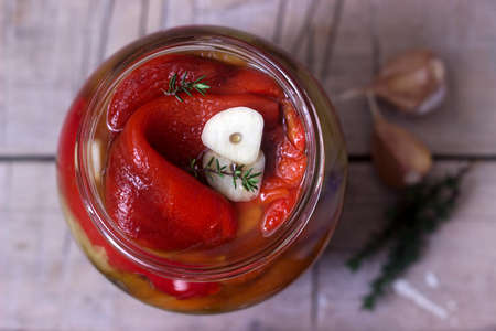 Baked pickled sweet pepper with garlic and thyme in a glass jar. Selective focus.