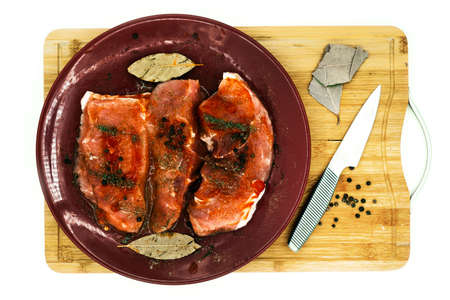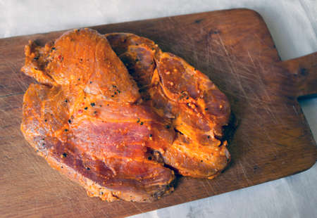 Raw pork meat seasoned for cooking on wooden plate