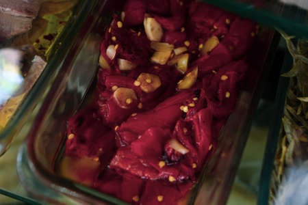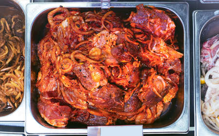 meat heavily marinated with red hot spices, in stainless steel containers at butcher shop