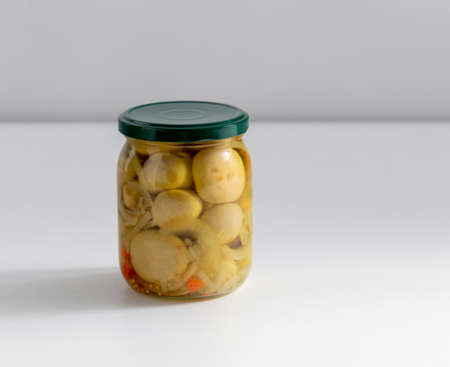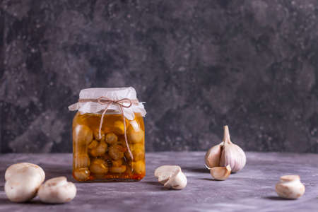 Fermented canned champignon mushrooms in a glass jar with garlic and bay leaf