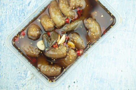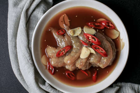 Pickled Shrimp in soy sauce with garlic on white plate(Saewoo-Jang). Asian food style.