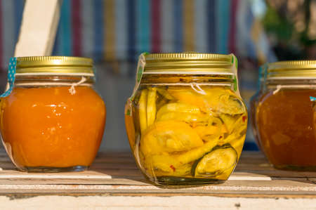 Close up of homemade vegetable preserves at farmers market. Fermented food in mason jars
