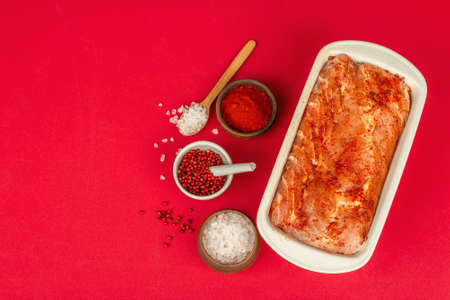Pickled pork loin ready to bake on a red matte background. Fragrant spices, useful ingredient for cooking healthy food, copy space