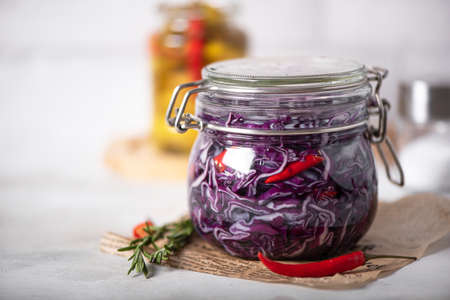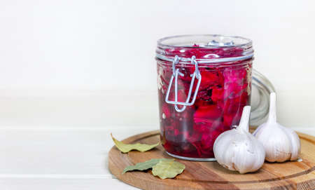 Fermented red cabbage lies in a glass jar. Sauerkraut with spices. Horizontal orientation with copy space.