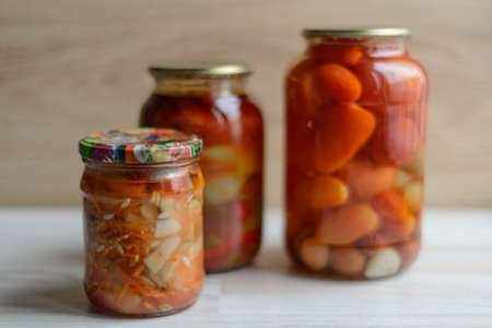 3 glass jars of pickled vegetables, home-cooked for a unique recipe. garlic. tomatoes, peppers, carrots and more.