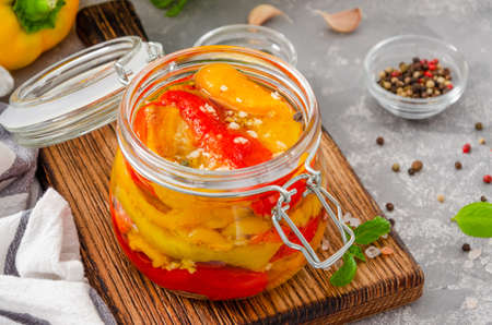 Roasted marinated bell pepper with garlic and spices in a jar on a board on a gray concrete background. Copy space