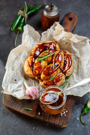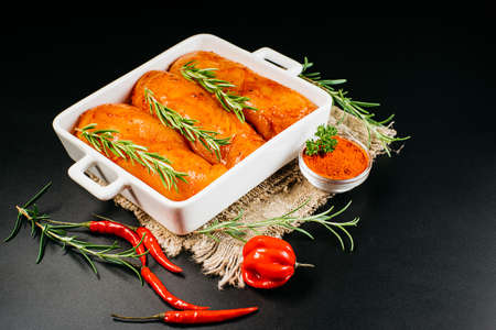 Marinated Chicken Breast with spices and rosemary.Chicken fillet in red marinade with spices.