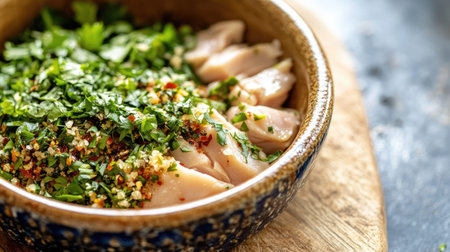 A beautifully arranged bowl containing fresh chicken, vibrant herbs, and spices, perfect for cooking delicious meals and enhancing flavors.
