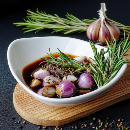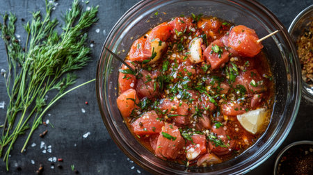 A juicy flank steak marinating in a bowl with herbs, olive oil, and garlic, ready for grilling.
