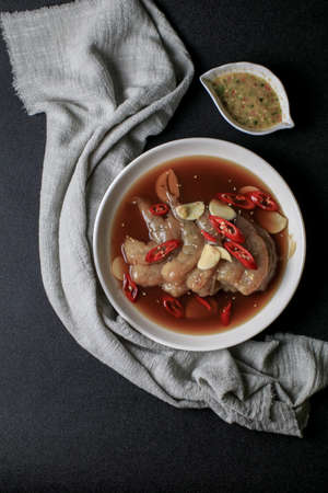 Raw pork neck meat cut in slices with marinated in glass bowl in a modern kitchen. Shallow depth of field. Toned