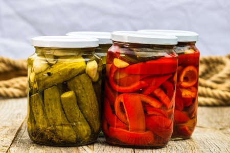 Glass jars with pickled red bell peppers and pickled cucumbers (pickles) isolated. Jars with variety of pickled vegetables. Preserved food concept in a rustic composition.