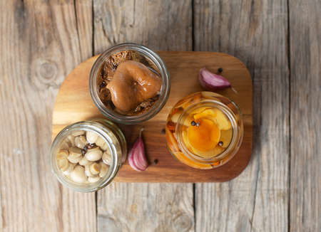 Glass jar with canned mushrooms with garlic and pepper. Fermented food on a wooden table