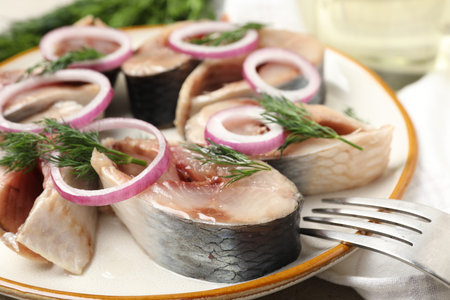 Close-up of marinated herring fillets with mustard seeds. Traditional pickled fish dish often served as an appetizer or snack in European cuisine
