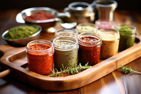 jars of homemade meat rubs on a wooden tray, created with generative ai