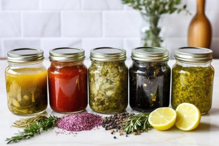 various homemade marinades in labelled jars, created with generative ai