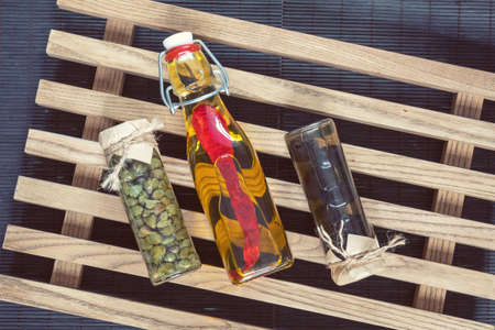Bottle of olive oil with chili pepper, black olives and capers in jar. The rustic wooden lattice, black makisu.