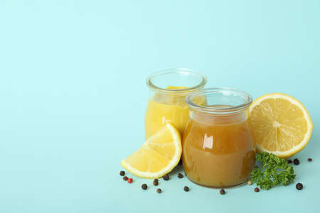 Set of dressings for salad: sauce vinaigrette, mustard, mayonnaise or ranch, balsamic or soy, basil with yogurt. Dark white concrete table. Copy space