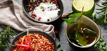 Herbs and condiments on black stone background. Top view with copy space.