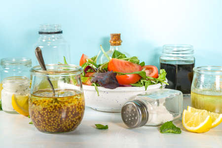 Healthy spring salad with various homemade dressings, salad sauces,