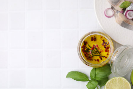 Tasty fish marinade in jar and products on light tiled table, flat lay. Space for text