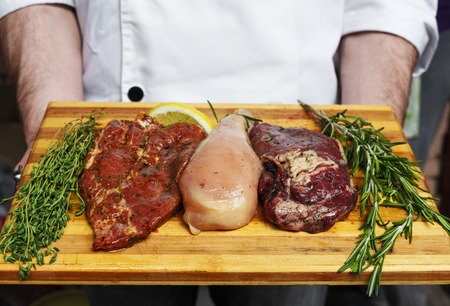 Chef holds fresh steaks ready for BBQ cooking - pork, beef and chicken.