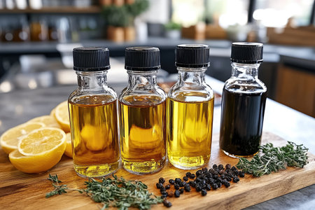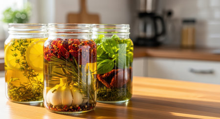 Herb-infused olive oil jars with spices and citrus in sunlit kitchen