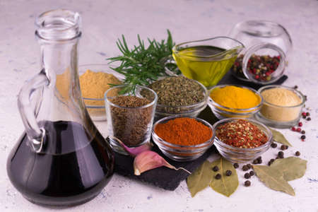 Sauces and spices on a white table. Close-up.