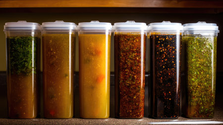 A vibrant collection of homemade stocks displayed in clear containers on a kitchen countertop, showcasing varying colors and ingredients for culinary enthusiasts.