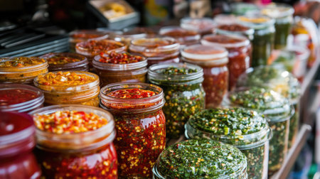 A vibrant market stall filled with homemade sauces, with jars of chili, garlic, and herb-infused blends, capturing the essence of local culinary craftsmanship.