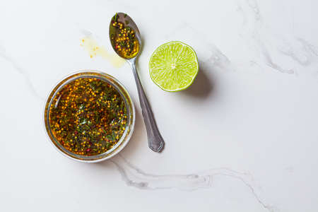 Mustard, olive oil and dill salad dressing in a glass jar, top view. Cooking healthy food concept.