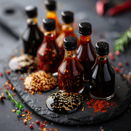 A vibrant lineup of sauce bottles showcasing various flavors and spices. Perfect for culinary creations, garnishing, or enhancing dishes.