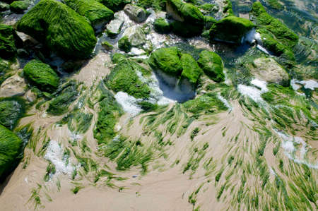 on the shores of the Pacific Ocean, algae are left at low tide and thick water the sea brings algae to the shore They lie like a carpet water splashes on them green and brown create a barrier