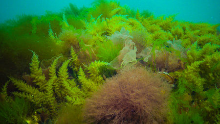 Underwater landscape, Black Sea. Green, red and brown algae on the seabed (Ulva, Enteromorpha, Ceramium, Cladophora, Porphira)