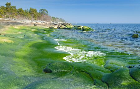 beautiful sea shore covered in vibrant green algae in autumn sunlight