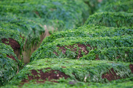 Laomei Reef in Shimen, Taiwan, transforms into a mystical shoreline as vibrant green algae weave a natural tapestry on rocky shores kissed by the ocean.