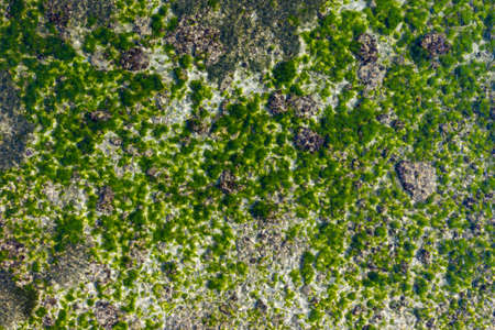 Green moss growing on the stone at the stones at the Corniche park in Dammam, Kingdom of Saudi Arabia