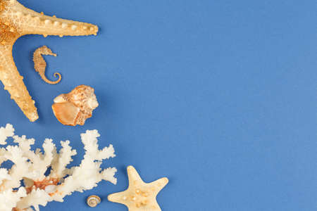 Seashells, starfish and ship steering wheel on blue background