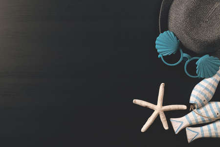 Summer and Holiday concept.beach accessories on dark wooden board