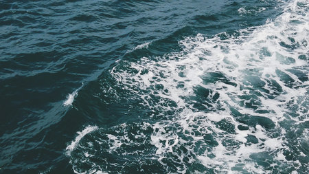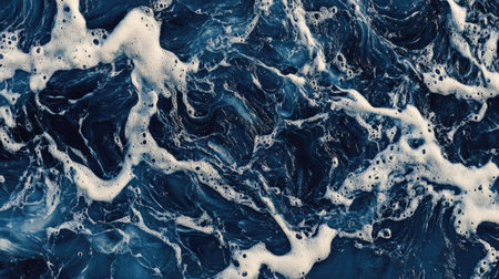 Deep blue ocean water with swirling waves and splashes. Top view of vibrant seascape with sea water
