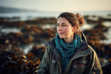 Casual woman with a bun hairstyle and blue scarf gazes thoughtfully, wearing a jacket. Blurred background of rocky coast with seaweed. Soft lighting creates serene, contemplative mood
