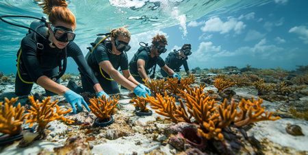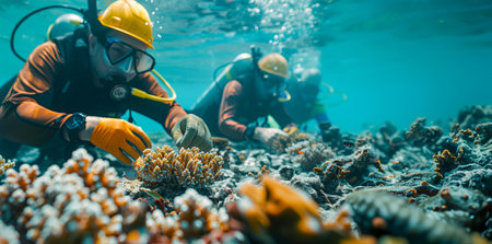 Reef Restoration, Diver Plants Small Corals on Ocean Floor, Restoration of Dead Corals, Coral Plantation, Generative AI Illustration