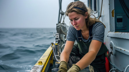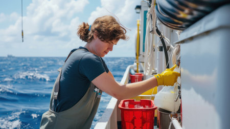 A marine scientist examines water samples on a research vessel, conducting environmental analysis on the open sea. AIG41
