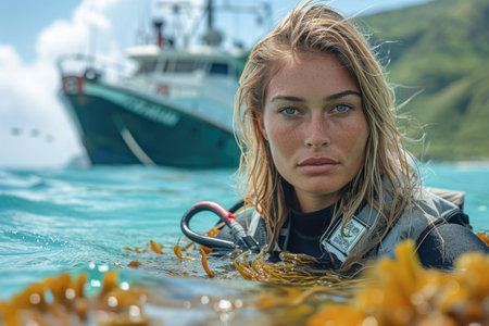 Beautiful young woman in wetsuit looking at camera while lying on seaweed in front of boat