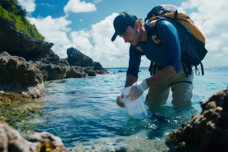 Marine biologist collecting water samples along the rocky coast, engaging in scientific research to analyze ocean health and biodiversity