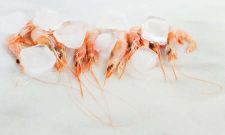 assortment of frozen seafood on ice cubes, shrimps, Babylonia areolata shellfish snails, langoustines, rich in iodine, antioxidants and vitamin, top view, copy space
