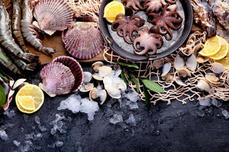 assortment of frozen seafood on ice cubes, shrimps, octopus, Babylonia areolata shellfish snails, langoustines, rich in iodine, antioxidants and vitamin, top view, copy space