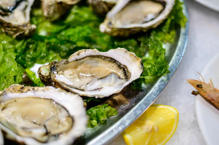 Catch of the day, fresh raw oysters and sea food on ice in fish restaurant in Terracina, Italy close up