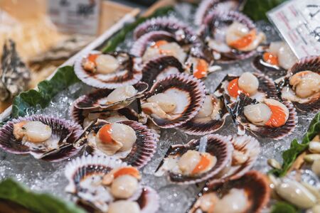 Rare seafood in a signature display case. Labels contain the name of the products.Scallops, shrimps, lobsters, shells, shells with mussels are laid out on ice on a store counter.